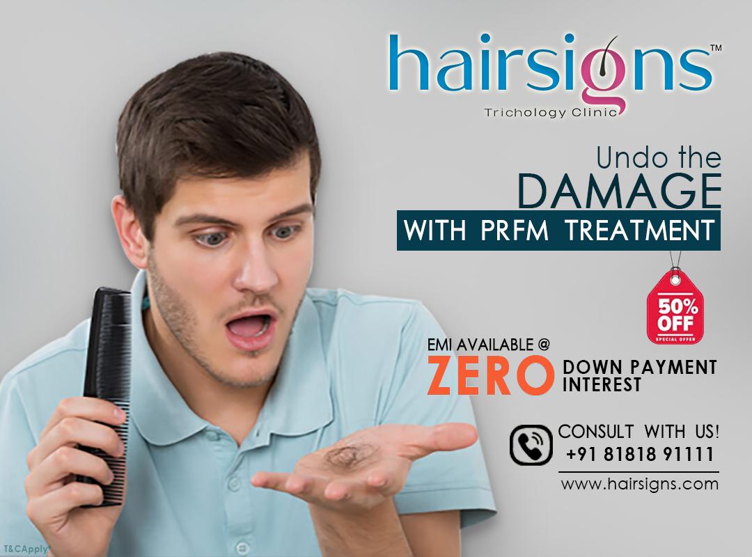 PRFM is a advanced treatment in which growth factor will be derived from patients own blood with the help of centrifugation and the tubes which HAIR SIGNS using for deriving PRFM will contain added advantage of our laboratory derived argon cells, growth activators and protector for hair follicle for further prevention of hair fall due to DHT (Di-hydro Testosterone), so that there is no further risk of hair fall. there will be minimal pain